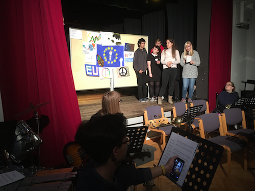 In fünf Arbeitsgruppen hatten die jungen Leute sich Gedanken gemacht zu Europa. Ist es in Gefahr? Was kann getan werden, das „Haus Europa“ zu stärken, ihm neue Ziele zu setzen? Sie waren künstlerisch aktiv, sie sangen für Europa, sie tanzten für Europa, sie stellten ihre Ängste und Hoffnungen in kurzen Theatersequenzen und mit Worten im Poetry Slam vor und wurden dafür frenetisch von Gästen und Zuschauern in der Aula des UGN gefeiert. Sie schlüpften dabei unter anderem in die Haut von Donald Trump oder Theresa May. „Bravo a tous!“, rief Anne-Marie Poutiers, „extraordinaire, fantastique.“ Diese Worte musste niemand übersetzen, Poutiers drückte aus, was alle in der Aula spürten: Von dieser Jugend geht Begeisterung aus, der unbedingte Wille, ein gemeinsames Europaweiter zu bauen.