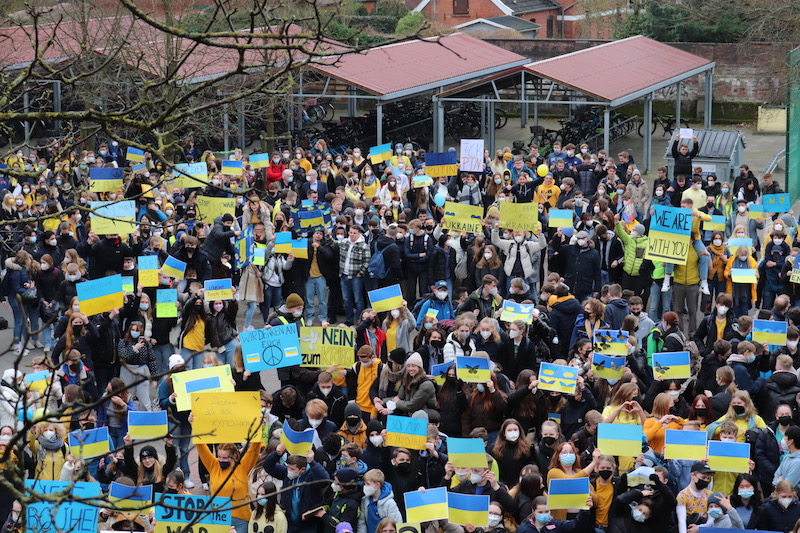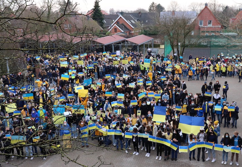 Wir denken an sie, wünschen ihnen von Herzen, dass sie und ihre Familien den Krieg überstehen, so gut es eben geht. Damit sie wissen, dass uns ihr Unglück nicht gleichgültig lässt, werden wir uns am Dienstag, 1.3. um 11.30 Uhr auf dem Schulhof zu einer Solidaritätskundgebung versammeln und ihnen ein Foto mit dieser Botschaft schicken: Wir denken an euch, liebe Freunde! Wir sagen NEIN zum Krieg und zu seinem Verursacher.