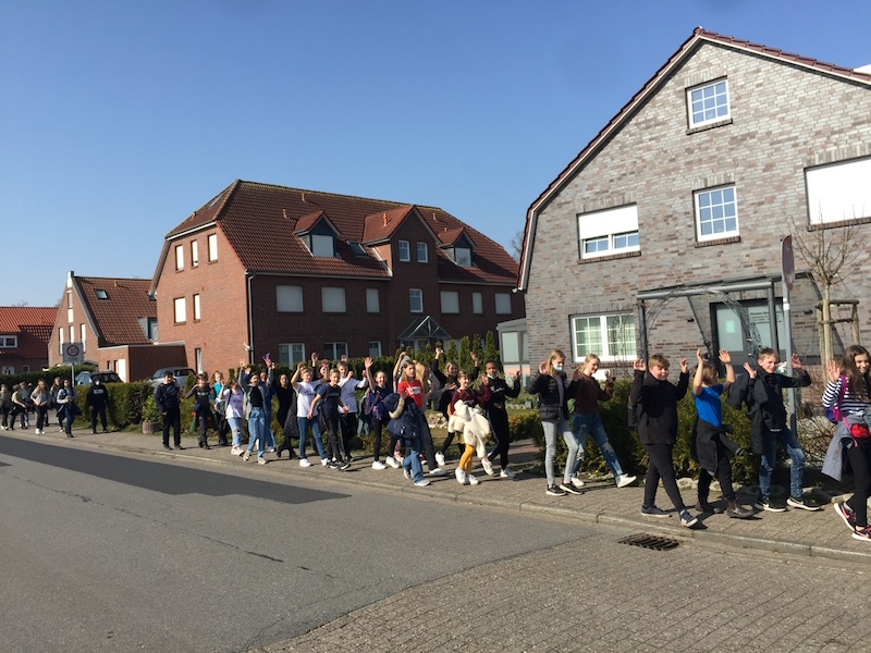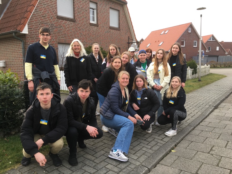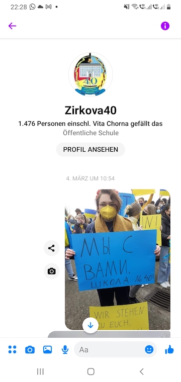 Zunächst stand neben einer allgemeinen Betroffenheit vor allem die Besorgnis um unsere ukrainischen Austauschpartner im Vordergrund. In einer schulinternen Kundgebung auf dem Schulhof wurden Fotos der Solidaritätsbezeugungen mit unserer Partnerschule in Kiew aufgenommen und unter anderem auf der Facebookseite der Partnerschule gepostet. Unsere Aktion wurde von unseren ukrainischen Freunden trotz ihrer existentiellen Sorgen bemerkt: 1476 Personen, die i.d.R. der Schulgemeinschaft unserer Kiewer Partnerschule angehören, haben bis zum 4. März die Fotos geliked."